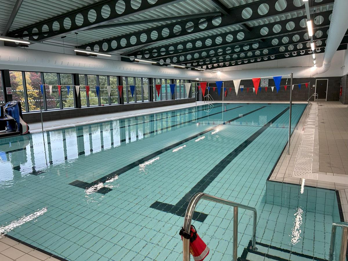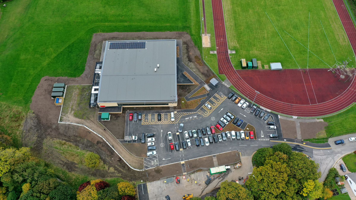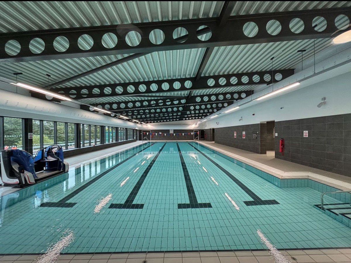 External facilities include sports pitches and an athletic track. Designed by Pozzoni Architecture Limited and delivered by Alliance Leisure, the centre incorporates environmentally-friendly and sustainable solutions, achieving A-rated energy efficiency with fossil fuel-free heating, cooling, and hot water systems powered by solar and energy-efficient technologies.